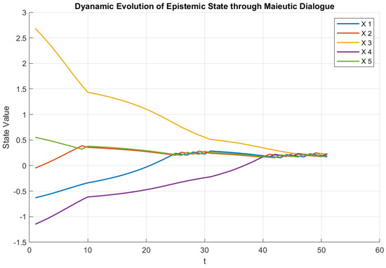 It is therefore appropriate to look at a dynamical system reviewed as follows: the maieutic question Q becomes a way to perturb the system until it goes into a new stable attractor basis. This means that Q is, in the formalism of dynamical system, the forcing function. The interlocutor (learning agent) is represented by the state vector of the system . The dimension of the state corresponds to the levels of a conceptual domain belief of attention focus. The values of the state component represent confidence, activation, or coherence. The values of the initial state are given, representing the initial learner.