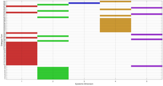 Visualization of the sequence of maieutic questions along the 5 epistemic dimensions. Each row represents a dialogue turn, while the columns the state components. The colored pixels indicate that the state component has been solicited in that specific step (so it is equal to 1), while the blank ones correspond to “0” (not solicited).