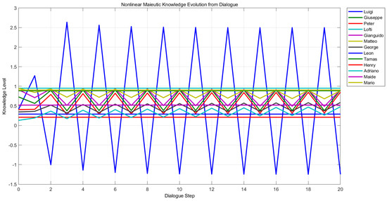In Figure 3, the dynamical evolution of the epistemic state through maieutic dialogue is reported. It shows as the learner achieved the task of the questioner. The sequences of maieutic questions that allow one to achieve the results are shown in Figure 4.