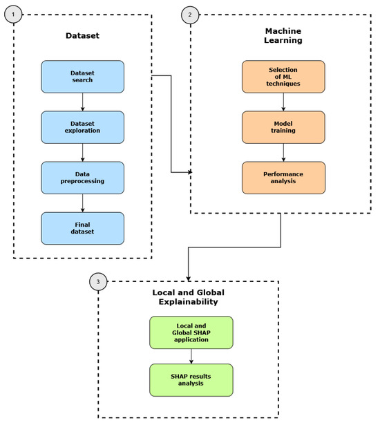 The dataset should be searched, analyzed, and pre-processed until a suitable group of data is obtained. Subsequently, ML models are selected, trained, and their results analyzed. Finally, the best performing model is chosen, and SHAP is applied to interpret the outcomes.
