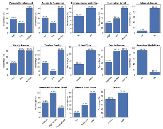 Before training the machine learning models, an initial exploratory data analysis (EDA) was conducted to understand the structure and distribution of the dataset variables. This analysis serves to identify potential patterns, outliers, or imbalances that may influence the learning process. Table 2 summarizes the main descriptive statistics for the numerical variables, including central tendency and dispersion measures. These figures provide a preliminary indication of student behaviors and performance levels across the sample. In parallel, Figure 2 displays the distribution of categorical features using bar plots, offering insights into the relative prevalence of various psychosocial, demographic, and contextual attributes. Together, these descriptive analyses establish a foundational understanding of the data and support informed decisions in subsequent preprocessing and modeling stages.