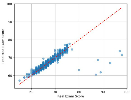 During the analysis of the model’s performance, an interesting pattern was observed in the exam score predictions. Although some values in the original dataset exceeded 80 points, the model tended to predict scores within a narrower range, approximately between 55 and 75. This limitation can likely be attributed to the distribution of the training data, which was heavily concentrated within that interval. Figure 3 shows a scatter plot comparing the actual exam scores (x-axis) to the predicted ones (y-axis), where each point represents a single student. It becomes evident that the model systematically underestimates the highest scores, particularly when the actual exam score surpasses 80 points. This effect is caused by the limited representation of high scores in the training data, which reduces the model’s ability to learn accurate mappings in that range. As a result, the model regresses toward the mean and struggles to generalize at the upper extreme.