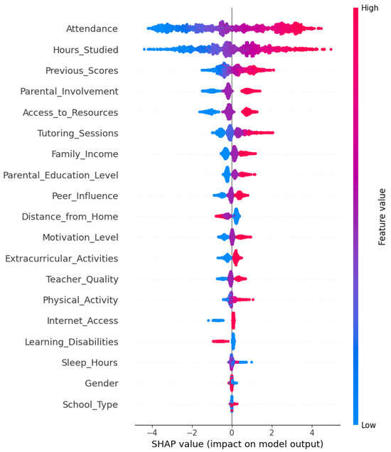 The application of SHAP provided interpretable insights into the model’s predictions, allowing for a transparent identification of key predictors. Notably, features related to prior academic performance—such as previous scores, hours studied, and attendance—emerged as the most influential. These findings reinforce long-standing assumptions in the educational literature about the centrality of academic engagement and preparation [16,17]. However, the analysis also highlighted the relevance of factors often considered secondary in predictive modeling, including parental involvement, access to resources, and teacher quality, which showed moderate but consistent contributions to the model’s outputs.