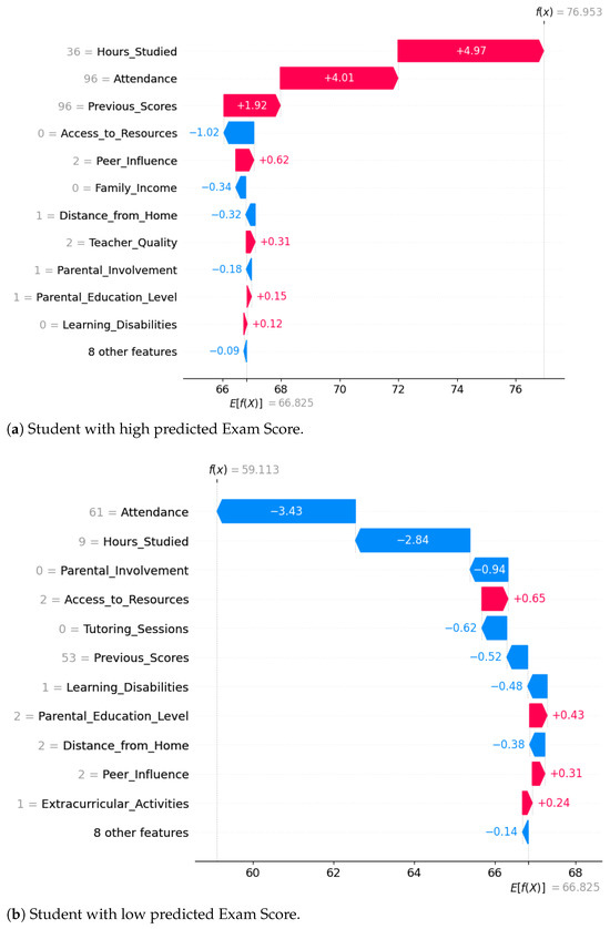 SHAP waterfall plots for two different students. Red bars indicate features that increase the predicted Exam Score, while blue bars indicate features that decrease it.