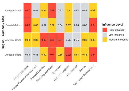 Although the number of small enterprises (SEs) in the adopting-firms subsample is relatively lower (n = 90) compared to microenterprises, this size is adequate for exploratory comparative analysis. Similar studies on technology and AI adoption in SMEs have employed subgroup sizes of comparable magnitude, particularly when disaggregating by firm size or sector [22,55,56]. Our analytical goal is not statistical generalization at the national level but the identification of comparative patterns across subgroups. In this sense, the MSE sample provides sufficient coverage to reveal adoption profiles while reflecting the structural distribution of Ecuadorian MSEs, where microenterprises overwhelmingly predominate.