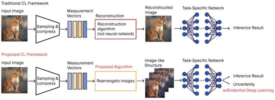Diagrams of the traditional CL framework (above) and the proposed CL framework (below). Traditionally, reconstruction is performed to compensate for information for inference. In contrast, we rearrange the measurement to achieve an image-like structure without extended dimensions. This prevents an increase in the model size of the task-specific network. Furthermore, to address concerns regarding ambiguous predictions, we employ evidential deep learning (EDL) to quantify uncertainty.