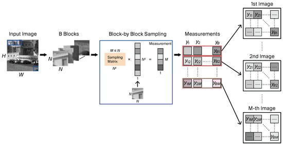 Block-based CS (BCS) [56,57], which divides the input image into several small square blocks and samples from each block, is a mainstream sampling technique due to its small sampling area, allowing for easy and fast signal acquisition. We use it to obtain measurement vectors and transform them into several images, as shown in Figure 2. First, using blocks, input image is divided into B (=) blocks. Then, each block () is sampled according to the CS sampling rule. Specifically, the measurement vector is obtained by multiplying the sampling matrix ∈ () and the block . By performing this operation for all blocks, B measurement vectors are obtained.