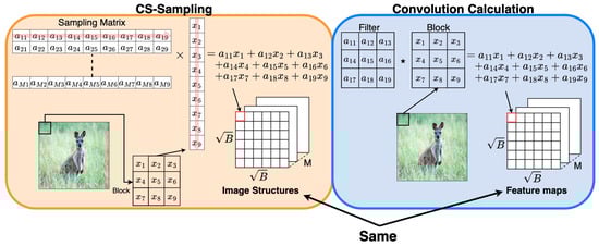 A key insight is that this computation closely resembles the operation of a convolution [58]. In standard convolution, each filter computes the sum of element-wise products between its weights and a local image patch, generating feature map values as the filter slides over the image. Similarly, in the proposed method, the image blocks serve as sliding windows, and the sampling matrix rows play a role analogous to convolutional filters. As the blocks shift across the image, the resulting values populate spatially organised structures, effectively forming feature maps.