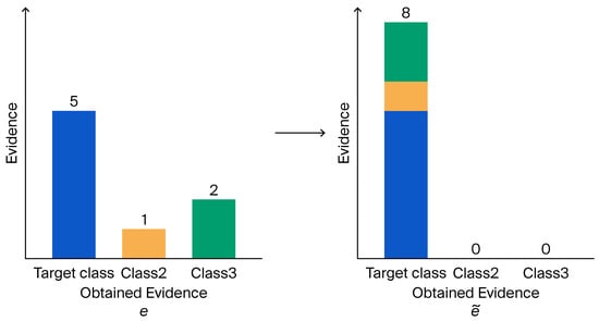 To solve this weakness, we introduce the distribution , which adds evidence assigned to incorrect classes to the target class, as shown in Figure 4. By computing the Kullback–Leibler (KL) divergence between the original evidence distribution and the transformed distribution , we penalize evidence assigned to incorrect classes. This encourages the model to concentrate more evidence on the correct class while reducing spurious confidence in incorrect predictions. Mathematically, this calculation can be expressed as follows:
