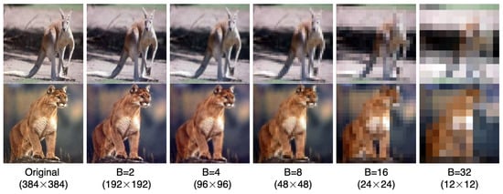 The visual changes in the generated feature maps when changing the block size, B, are illustrated in Figure 5. We resized all images to 384 × 384 for easier comparison. It can be observed that as the block size increases, the image size decreases, leading to a loss of information on object characteristics, such as edges and textures. When inputting these feature maps into a task-specific network, it cannot retain the features of the input image fully. On the other hand, smaller image sizes result in smaller model sizes. Thus, there would be a trade-off between model size and performance.