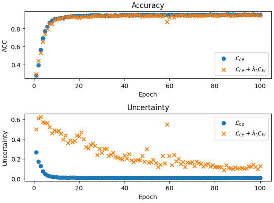In Figure 6, we show the comparison of accuracy and uncertainty between the traditional EDL loss function and the loss function with proposed constraints, i.e., , when changing the number of epochs. It can be seen that, shortly after the start of training, the uncertainty of becomes almost zero. On the other hand, with , uncertainty decreases as training progresses, preventing it from becoming extremely small. This behavior indicates that the proposed KL-augmented loss inherits the stable convergence property of KL divergence, which has been empirically observed across various machine learning tasks.