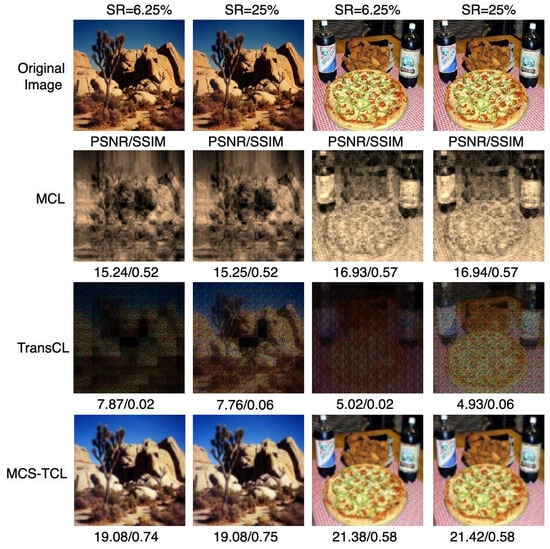 The objects in the images input by MCL are blurry, and colour is lacking. TransCL suffers from boundary lines and noise due to block-based compressive sensing (BCS) [56], and its impact becomes more pronounced as the SR decreases. Therefore, the PSNR and SSIM of these images are extremely small, especially for TransCL. In contrast, through our approach, there is little to no visual change even as the SR decreases. Moreover, considering the high PSNR and SSIM, it seems that the essential features required for identifying the input images are retained.