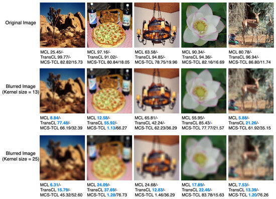 Images input into a CL system may not always be clean. In real-world applications, they often contain noise or even appear blurred. We demonstrate that our proposed method remains robust even under such degraded image conditions. We apply a Gaussian filter with horizontal and vertical blurring strengths of 10 and 20, respectively. The larger the kernel size, the more blurred the image borders become. We present the comparison results of class probabilities when inputting images with these parameters changed to 0 (original), 13 and 25, as shown in Figure 8. Since MCS-TCL follows EDL, the uncertainty of predictions is also quantified. For the original image, all methods estimate the correct class with a high probability. However, when the kernel size is increased, all methods often output incorrect classes. The issue is that existing CL methods output incorrect answers with high probabilities, especially TransCL, making the system unreliable for users. On the other hand, MCS-TCL outputs relatively few incorrect classes with very small probabilities. Since MCS-TCL is trained with feature maps that lack detailed information on the input image, as shown in Figure 7, our proposed method would be robust to noise. In other words, it excels at recognising global features, and the inference results may not be affected by changes in detailed information.
