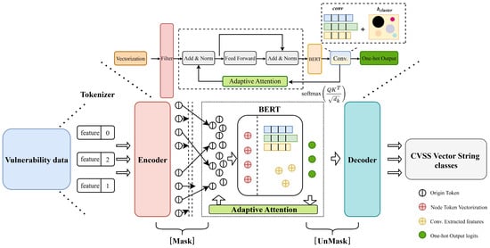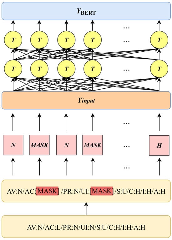 Token masking segments the string into minimal tokens to accurately localize specific indicator values for masking operations, thereby preventing the model from disrupting logical associations between labels and values and enabling the model to learn finer positional relationships in text [38]. This model utilizes the masked language modeling capabilities of BERT to implement token masking on CVSS vector strings. For the input CVSS vector string label