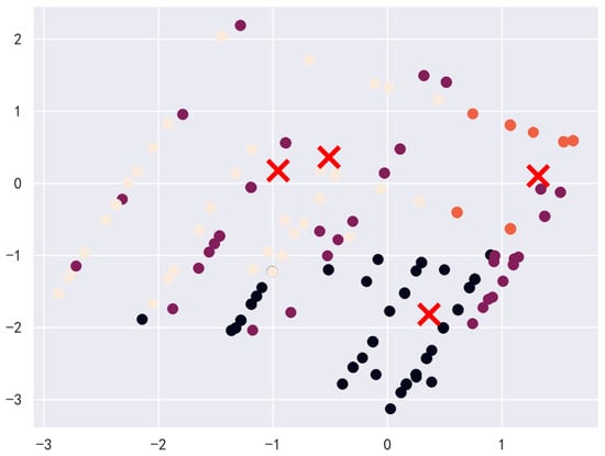 However, considering practical constraints, excessively low dimensionality reduction may lead to an insufficient data volume in some clusters. Therefore, we select a configuration of 2-dimensional reduction with 4 clusters, which significantly mitigates the sample distribution imbalance issue [31]. The resulting clustering outcomes are visually presented in Figure 3, where the x-axis represents the first principal component, and the y-axis represents the second principal component. Principal components are linear combinations of all original features. The first principal component (PC1) indicates the direction that maximizes data variance, while the second principal component (PC2) is orthogonal to PC1 and explains the maximum remaining variance.