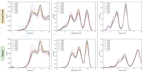 In this paper, we plot the real year density fitting curve and the predicted year CVSS scores density fitting curve to label vulnerability severity levels and compare the differences. Based on the density fitting graph of the experimental data, we observe that the predicted curve shows general consistency with the real curve, following the same trend. The fluctuations in the predicted curve maintain good synchronization with those in the real curve, and the error range remains within acceptable limits. Experimental results demonstrate that our model not only reasonably simulates past data distributions but also effectively predicts future trends. As Figure 9 showcases, this outcome proves the accuracy and stability of our model in capturing data patterns and verifies its generalization ability.