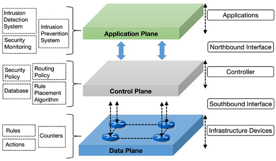 In contrast to conventional networking architectures, SDN architectures principally work by employing a fundamental structure around the decoupling of the control and data planes to enable a more centralized and intelligent management of network devices [72]. This architecture is critical for achieving programmability and dynamic network configuration. As depicted in Figure 1, the SDN architecture typically consists of three distinct planes: the application, control, and data planes, each serving specialized roles. The application plane encompasses applications, such as intrusion detection systems, intrusion prevention systems, and security-monitoring tools, which provide critical inputs for decision making [73]. The control plane, dominated by the SDN controller, governs network operations through security policies, routing strategies, databases, and rule placement algorithms [10]. Finally, the data plane comprises infrastructure devices responsible for executing network operations based on predefined rules, actions, and counters [10].