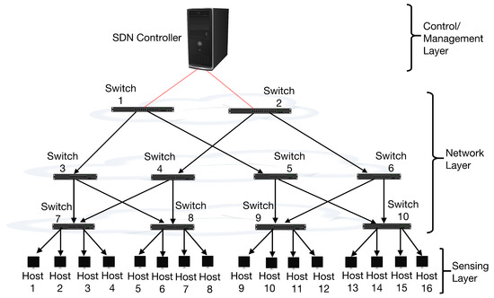 By utilizing switches of uniform capacity, Fat-Tree networks support predictable performance and enable line-speed transmission when packets are evenly distributed [78]. These characteristics provide an ideal foundation for IoT networks that require efficient and scalable data management. IoT networks are generally multilayered [79] and highly reliant on DCs that are also a part of the network infrastructure. This is especially true when taking into account the data-processing, storage, and management (including traffic management) levels in IoT networks [80]. The network topology used in this work, therefore, closely resembles a typical IoT network as previously established [71]. Similar IoT architectures, featuring tree topologies, hierarchical layouts, and multilayer network designs, have also been reported in previous studies [6,7,56,81]. Therefore, the custom SDN architecture in this work adopts an IoT network with a tree topology (see Figure 2), facilitating wide-area network adaptability and scalability.