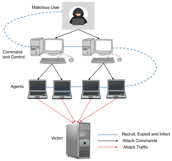 DDoS flooding attacks are carefully planned assaults that use a network of hacked devices, called botnets, to overwhelm a system. The goal is to clog up the network’s bandwidth or shut down specific servers and devices, making them unusable for regular users [15]. These attacks constitute a significant portion of the most dangerous malicious traffic on the internet [16]. Typically, attackers deploy these botnets to execute these operations covertly [17]. As a result, end users of the targeted network’s device nodes often remain clueless that their devices and internet protocol (IP) addresses are being used to perpetrate DDoS flooding attacks. IoT devices are especially vulnerable to coordinated DDoS flooding attacks because of how they are built and the fact that the internet does not enforce strict traffic control on individual devices [16]. This combination makes it easier for attackers to target and overwhelm IoT devices. This vulnerability is made even worse by the rapid growth in the number of IoT devices out there, even though their security is improving over time [18]. In the face of increasingly complex DDoS flooding attacks, the critical need for innovative and proactive security techniques that can address the particular vulnerabilities of IoT networks becomes imperative.