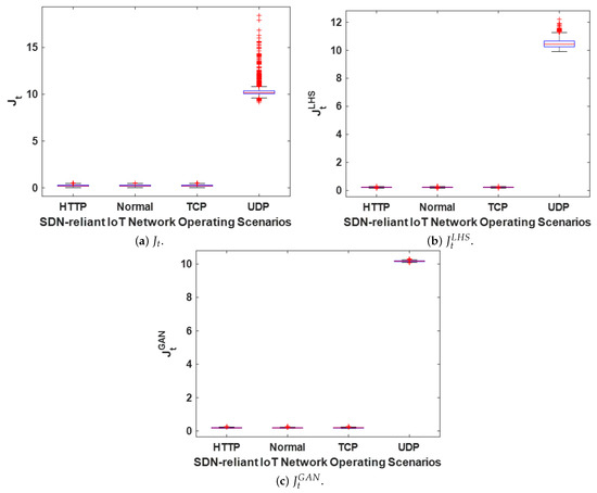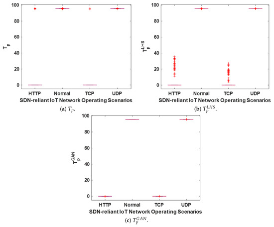 - Step 4: Shuffle the validated LHS and GAN metrics from Step 3 and combine them with the simulated data of metrics from Step 1 (i.e., [; ; ], [; ; ], and [; ; ]) for each of the SDN-reliant IoT network scenarios considered (i.e., normal, HTTP DDoS flooding attack, TCP DDoS flooding attack, and UDP DDoS flooding attack operating conditions) to have an augmented dataset for the network metrics, described as follows: