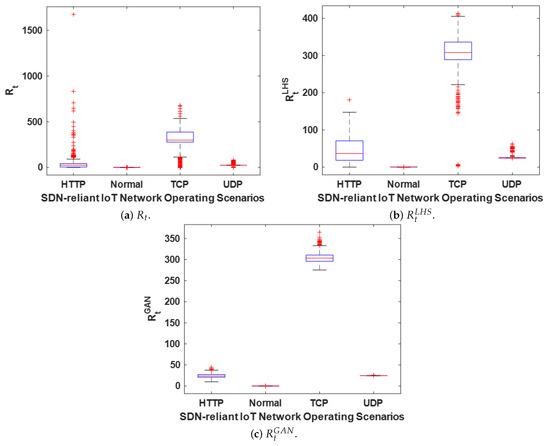 - Step 3: Validate the new LHS and GAN metrics (i.e., , , and and , , and in Equations (13) and (14), respectively) from Step 2 for each of the considered SDN-reliant IoT network scenarios (i.e., normal, HTTP DDoS flooding attack, TCP DDoS flooding attack, and UDP DDoS flooding attack operating conditions) using descriptive statistics and by building and comparing classification models using the standard scores (Z-scores) for [, , ], [, , ], and [, , ], respectively, and a suitable supervised learning technique (CART in this particular instance—see Section 4.2.2).The standardization procedure in this step is carried out as suggested in [39,71,126], and it can be described as follows:where is the Z-score of the ith observation for any metric (∈ {, , and }) having a mean and a standard deviation of and , respectively;