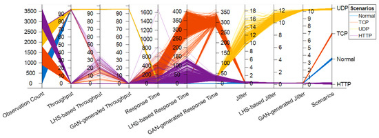 - Step 2: Use the collected data from Step 1 (i.e., ) to implement LHS-based DOE (see Section 4.1) and GAN-based synthetic data generation (see Section “Generative Adversarial Networks (GANs)”) concurrently and enlarge the parameter space by samples for each network scenario to mimic on-the-fly , , and metrics for the SDN-reliant IoT network. The new datasets from the LHS-based DOE and GAN-based synthetic data generation (i.e., and , respectively) can be described as follows:In this Step, N is set at 900 to match the number of observations per scenario for all the SDN-reliant IoT network scenarios considered (see Section 3.3);
