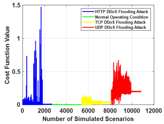 - Step 6: Generate response variables for every observation in by deriving a weighted cost function (), as recommended in [30]. Specifically, for the ith observation in can be derived as follows:where w is set at 1, 2, 3, and 4 when the SDN-reliant IoT network is operating normally, under a TCP DDoS flooding attack, under a UDP DDoS flooding attack, and under an HTTP DDoS flooding attack, respectively, as recommended in [30];