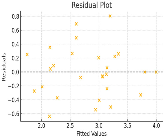 Figure 1 displays the residuals vs. fitted values, which confirm homoscedasticity and no major violations of OLS assumptions. Additional regression diagnostics are provided in Appendix A.