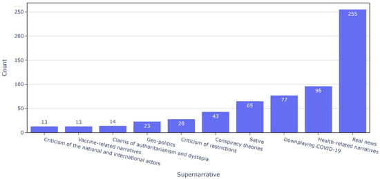 Distribution of super-narratives in the dataset. Although the class distribution initially appears imbalanced, the cumulative number of fake news across all categories is similar to the number of real news articles.