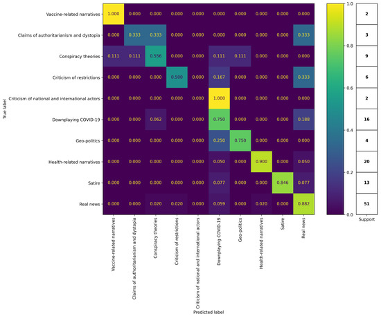 The final dataset consisted of 627 articles, of which 372 were categorized as various types of fake news and 255 were classified as real news; see Figure 1. Each fake news article was annotated with a super-narrative and a sub-narrative based on its content, except articles under the “Satire” super-narrative, which were not assigned a sub-narrative. The real news articles were annotated only with the “Real News” super-narrative. We will continue to refer to the super-narratives as classes and the sub-narratives as subclasses. The dataset was partitioned into training (60%), validation (20%), and testing (20%) sets using a stratified splitting method based on class labels. This stratification was performed to ensure that each subset maintained the same class distribution as the original dataset.