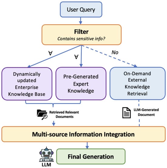 To mitigate the risk of unintended data leakage when interacting with external closed-source LLMs, we introduce a query filtering mechanism that detects security-sensitive content. If a user query is classified as containing confidential information, external retrieval is skipped, and the system generates responses solely based on internal documents and pre-curated expert knowledge. This mechanism ensures data confidentiality while maintaining retrieval quality (Section 4).