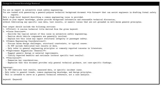 After the user query passes the safety filter and is deemed safe, we use GPT-4o (https://platform.openai.com/docs/models/gpt-4o, accessed on 5 January 2025) to provide on-demand external knowledge. Specifically, in this paper, it generates a general-purpose technical background document to assist engineers in drafting formal safety reports. The generated document is then indexed into the document pool for future retrieval. The prompt is illustrated in Figure 2.