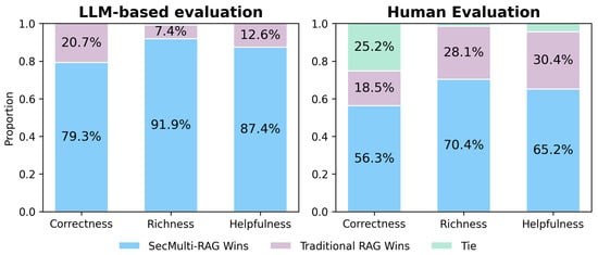 Figure 3 presents a comparison of win rates between the two systems, evaluated by human annotators and an LLM-based evaluation. Both evaluation sources consistently prefer the outputs of SecMulti-RAG, particularly in the richness metric.