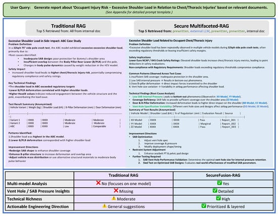 In this study, we primarily evaluate our RAG framework on the report generation task. However, in practice, the framework is scalable to various tasks and domains. We conducted a preliminary test with a few engineering questions in the automotive domain, as shown in Figure A5. The SecMulti-RAG responses include specific injury types, structural causes, and implications for official safety assessments, demonstrating greater richness and helpfulness compared to the Traditional RAG responses.
