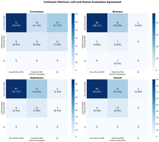 Confusion matrices showing the agreement between LLMs and human evaluations. Most counts lie in the diagonal cells, indicating consistent agreement between both evaluators.