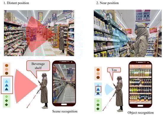 This study presents a seamless recognition system that enables VIPs to navigate complex environment using a single mobile device. As shown in Figure 1, the system operates in two distinct spatial interaction modes: (1) distal positioning, where the user scans the environment from a distance, and (2) proximal positioning, where the user moves closer to examine specific items. These two modes leverage a shared recognition model to interpret both scene and object information based on the relative scale of visual input. The system continuously analyzes the camera feed and delivers real-time auditory feedback, announcing the names of detected scenes and objects as users move through the environment. This dynamic feedback loop helps users build spatial awareness, identify relevant items, and make informed navigational decisions without requiring additional hardware or infrastructure.