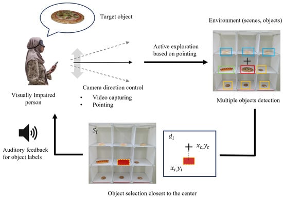 In order to minimize cognitive load and improve usability, the system implements an object prioritization mechanism that selects the most relevant object in each video frame, as illustrated in Figure 2. The system continuously recognizes multiple scenes and objects to dynamically understand the context. To ensure that users receive only the most pertinent information, the object selection mechanism evaluates both the proximity of detected objects to the center of the screen and their detection confidence scores.