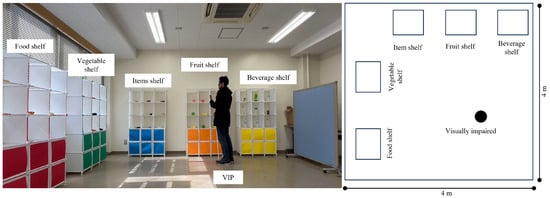 The experiment was conducted to evaluate the effectiveness of the seamless recognition system in a supermarket-like environment. As illustrated in Figure 4, the test was performed in a 4 m × 4 m indoor space designed to simulate a typical shopping scenario, featuring multiple shelves and a variety of common supermarket items. The shelves used in the environment measured 90 cm × 300 cm and were divided into five levels; only levels 1 to 3 were utilized for object placement.
