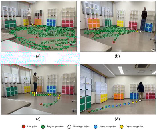 Trial example: from the top-left, the demonstration results of four assistive applications in a simulated environment: (a) Envision AI, (b) Lookout, (c) object-based method, and (d) scene-based method. The dots indicate the timing of participant movements. Blue dots represent moments when the system successfully recognized the target scene, yellow dots indicate successful object recognition, and white dots show when the participant successfully grabbed the intended object.