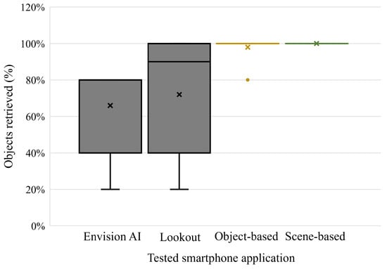 Objects retrieved (%) for each tested application. Each application was evaluated by ten participants, with each participant tasked to locate five target objects. Accuracy is calculated as the number of correctly retrieved objects divided by the total number of target objects, multiplied by 100%. The colors represent: grey indicates the baseline study, yellow indicates the custom-built study, and green indicates the proposed study.