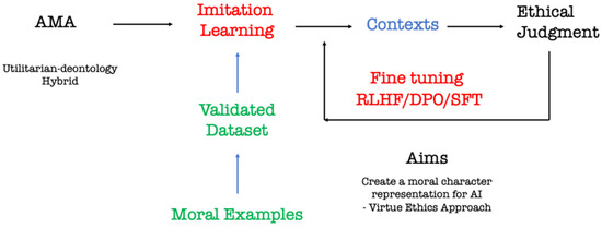 Secondly, we propose a Virtue Ethics-Based Character Modeling for AMA (see Figure 4), similar with the idea put forward by Martin Gibert [28] with more technicality. This will be a moral character representation model grounded in virtue ethics. This approach would operationalize phronesis (practical wisdom) through multi-objective optimization that balances competing virtues (e.g., courage vs. caution). We will implement contextual sensitivity by adjusting virtue weightings based on situational factors. Theoretically, we can enhance the AMA robustness through adversarial training against “virtue spoofing” attacks (where bad actors manipulate the system’s ethical parameters). This is akin to a vaccine which theoretically would teach AI to recognize and defend against malicious immoral inputs. The preliminary evidence suggests virtue-theoretic models demonstrate greater resilience against “jailbreak” attempts compared to purely consequentialist systems [29]. This aligns with the observed stability of character-based judgment in human moral psychology.