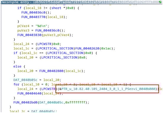Our analysis, supported by previous malware reports [7,8], reveals that Industroyer2 was developed with a high degree of target-specific knowledge embedded directly into the executable. This is evidenced by the presence of hardcoded configuration data, including IP addresses and protocol-level parameters. For instance, the analyzed sample contained the hardcoded IP address 10.82.40.105, which was embedded in the binary and used as the target endpoint. The malware’s entry routine includes this IP and the corresponding port, as illustrated in Figure 1.