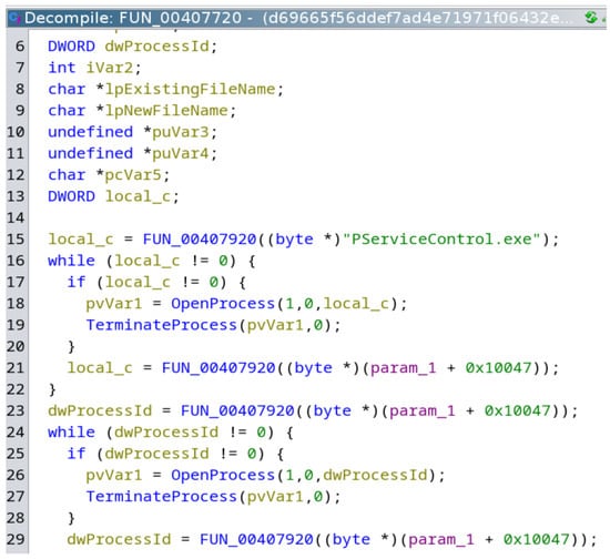 - Termination of existing processes: The malware begins by identifying and terminating processes responsible for communication between the substation and its control center. This is achieved using process enumeration and the TerminateProcess Windows API call (Figure 3).