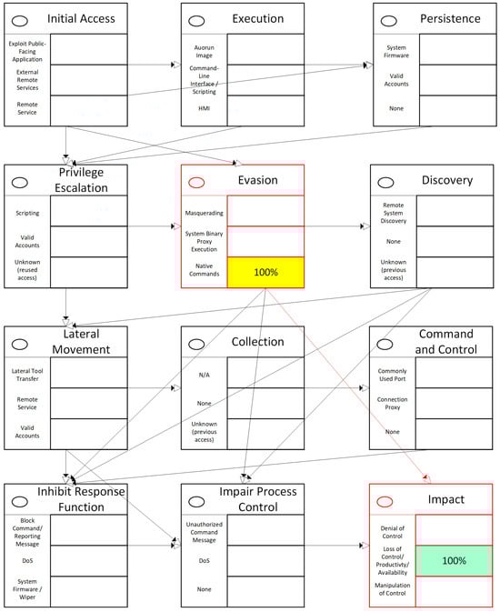 Figure 5 shows the BBN of the APT group digital fingerprint for the Sandworm group. The BBN is made up of relevant attack steps from MITRE ATT&CK for ICS, and models the core capabilities used by Sandworm in BlackEnergy, Industroyer, and Industroyer2. Each capability (or technique) has an associated color to help keep track of the state of each step, while pointed arrows model the alternative attack paths. For example, it is assumed that previously achieved access was used in Industroyer2. The attack in this case started with the Evasion step, where Native Commands are used (modeled using yellow color in Evasion step in Figure 6); the attack then moved directly to the Impact step to cause Loss of Control (modelled using green color in Impact step in Figure 6), as shown in Figure 6. More specifically, native IEC 104 commands were used and the attack had a very low footprint, including only two attack steps (Evasion and Impact). To detect such a low-footprint attack, detection methods need to compute the possible alternative attack paths and monitor all attack paths, including all variations (all possible combinations of attack steps and techniques that Sandworm could use based on their capabilities). Detection methods also require both process and system knowledge; for example, it is important to monitor the IEC 104 command sequences and associate them with the state of the process, such as whether the substation is in normal operation, maintenance, shutdown, etc. The reason for this is that while sending IEC 104 commands represents normal activity, it is not normal to send multiple single and double IEC 104 commands during normal operation, which should have been flagged as suspicious in the case of Industroyer2.