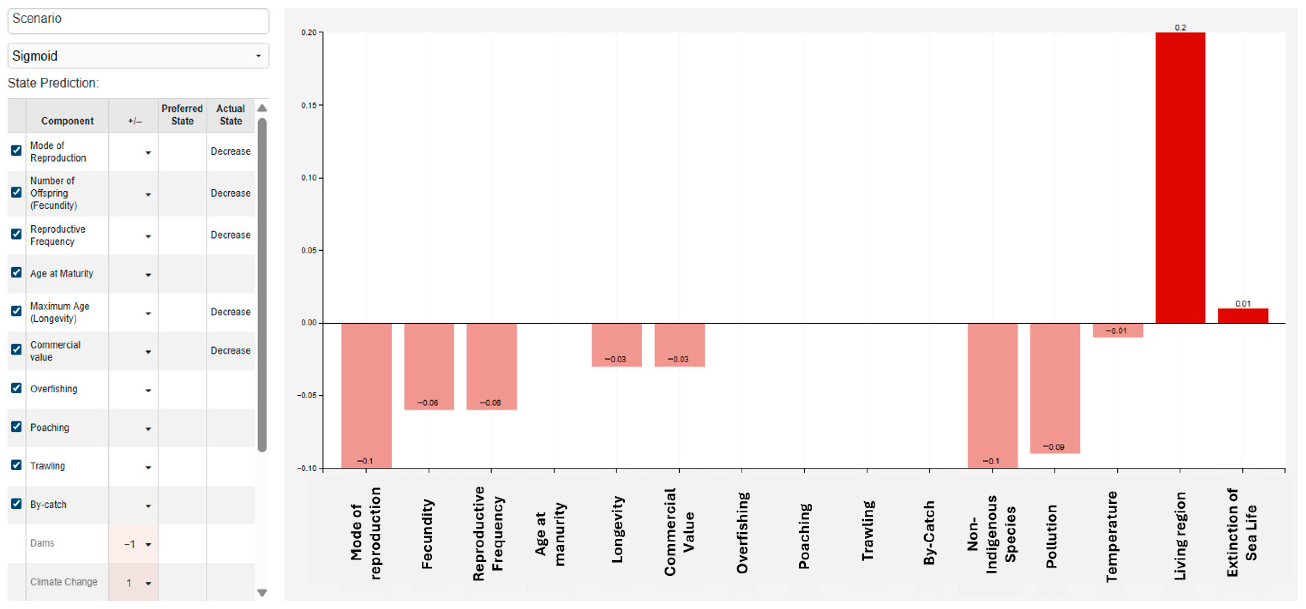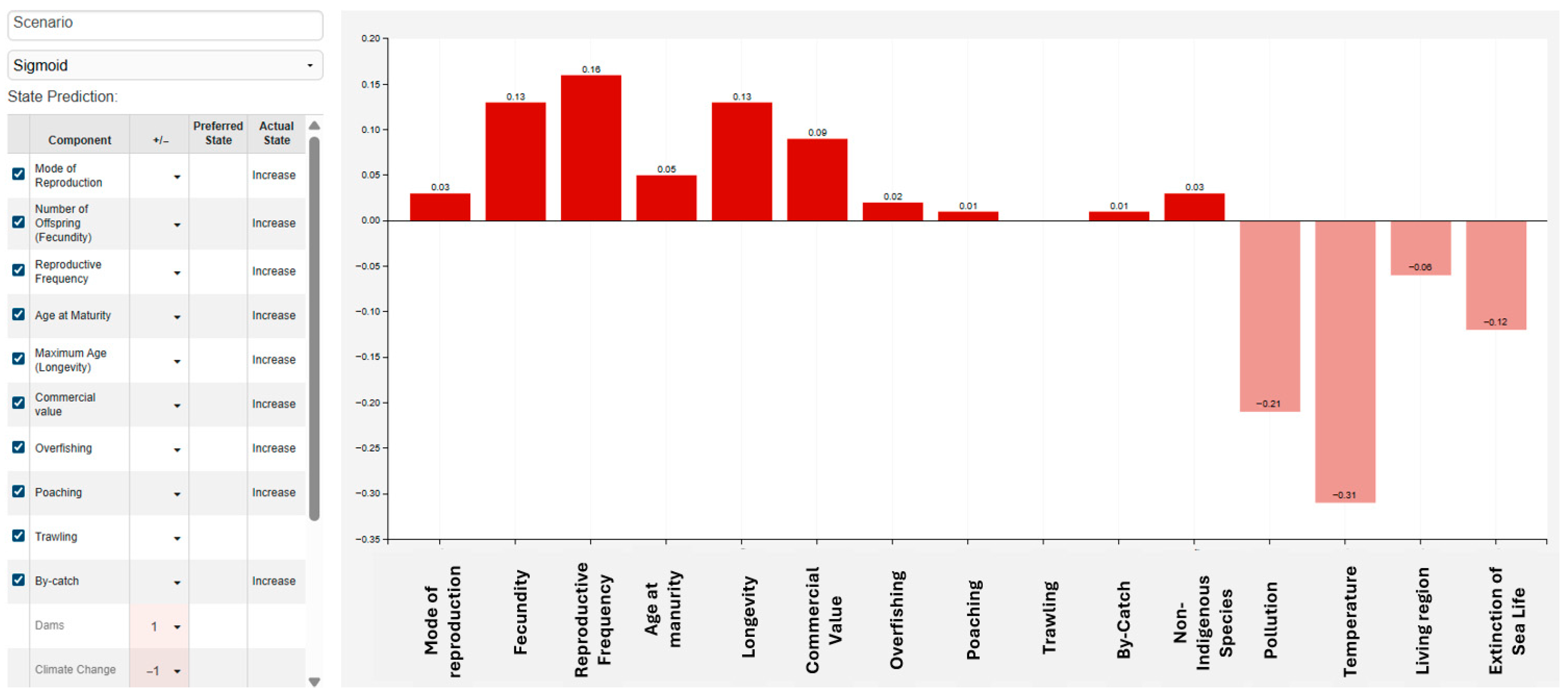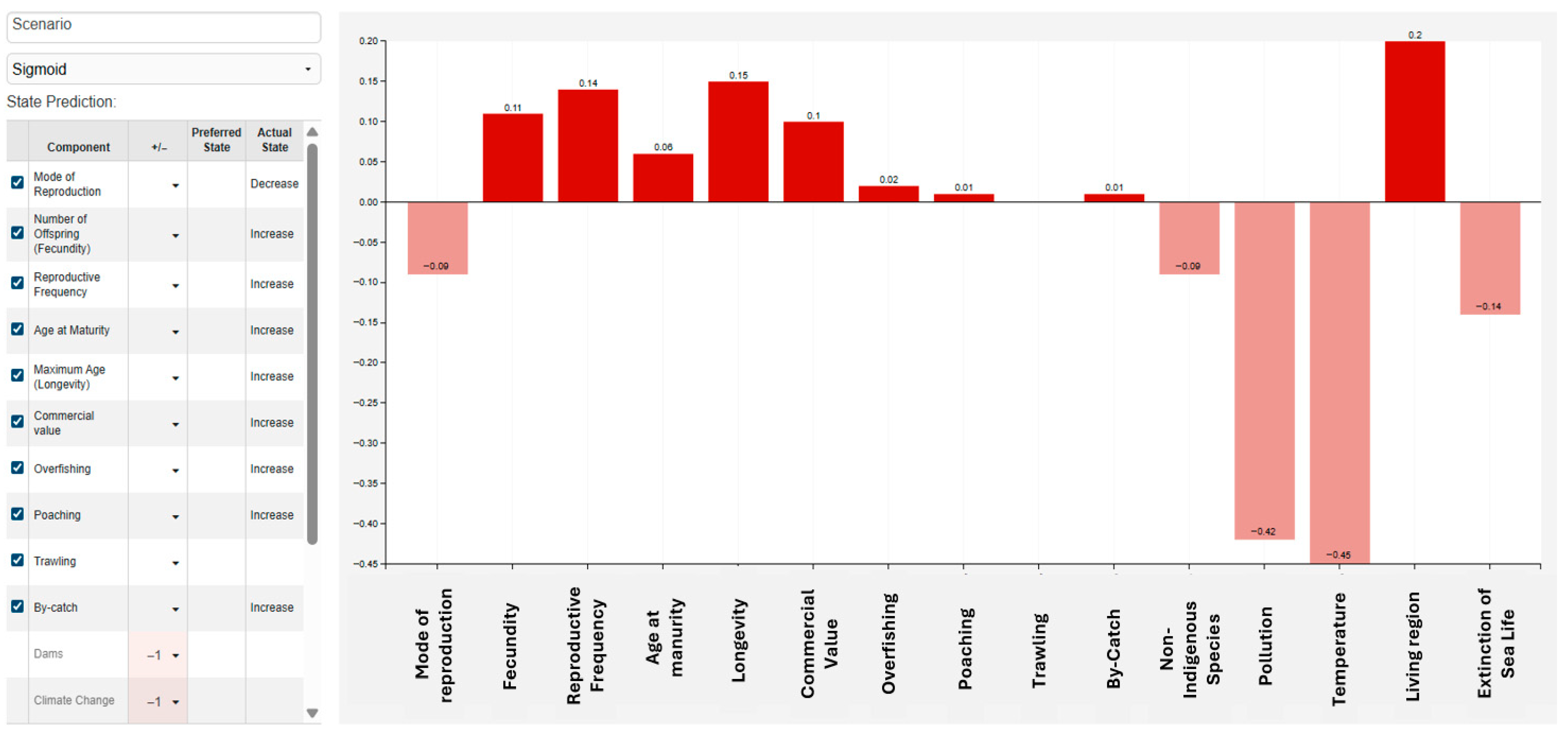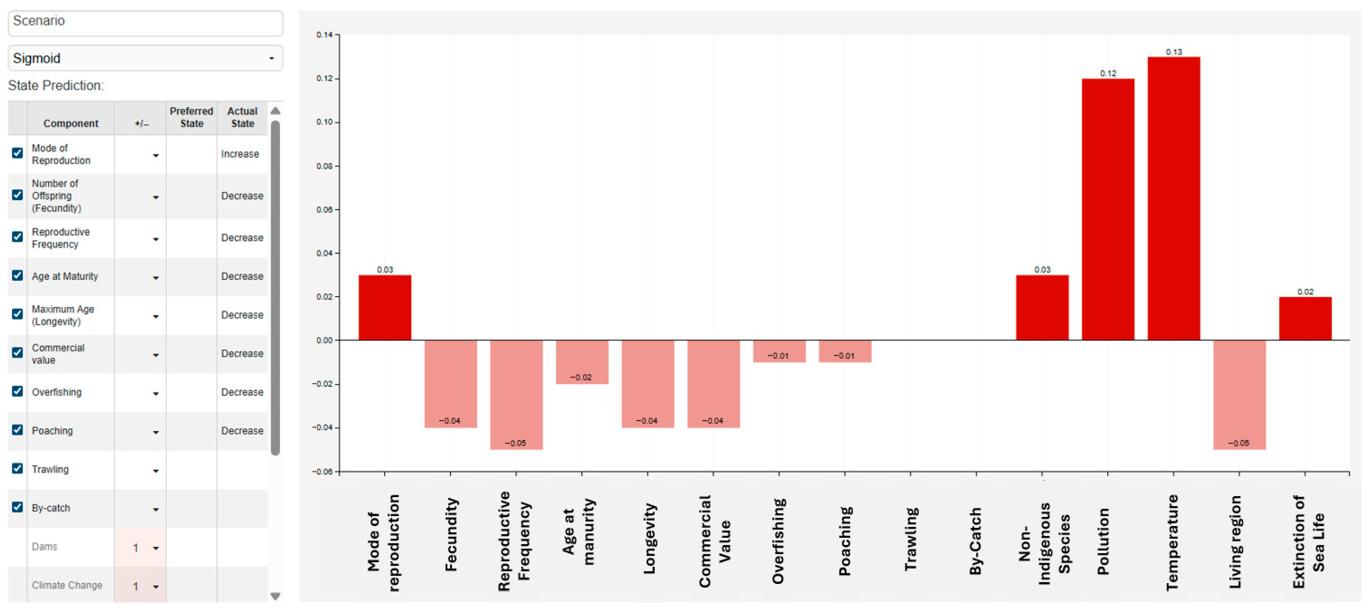 In an FCM, each concept represents a factor in the system (e.g., Climate Change, Pollution, Reproductive Frequency). The value of a concept reflects its current “activation level”, i.e., the intensity or state of that factor in the system. These values usually lie within a normalized range, such as [0, 1] or [−1, 1], depending on the transfer function used. More specifically: (a) a value close to 1 means the concept is highly active or strongly present (e.g., high pollution, strong climate change effect) and (b) a value close to 0 means weak activity or absence of the factor. In cases where negative values are used (e.g., with a hyperbolic tangent), negative values indicate inhibitory or adverse states. During simulation, these values are iteratively updated through the weighted causal relationships, until the system stabilizes. The final values of the concepts show how the whole system behaves under certain scenarios (e.g., with climate change mitigated vs. intensified).