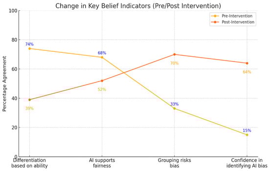 Participants’ endorsement of ability-based differentiation declined sharply from 74 per cent to 39 per cent (d = 0.92, p < 0.001). Belief that AI tools can help differentiate fairly also declined from 68 per cent to 52 per cent (d = 0.44, p < 0.05), suggesting emerging scepticism toward algorithmic authority (Figure 2). Meanwhile, agreement that grouping risks reinforcing bias rose from 33 per cent to 70 per cent (d = 0.95, p < 0.001), and confidence in identifying AI bias increased dramatically from 15 per cent to 64 per cent (d = 1.05, p < 0.001).