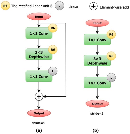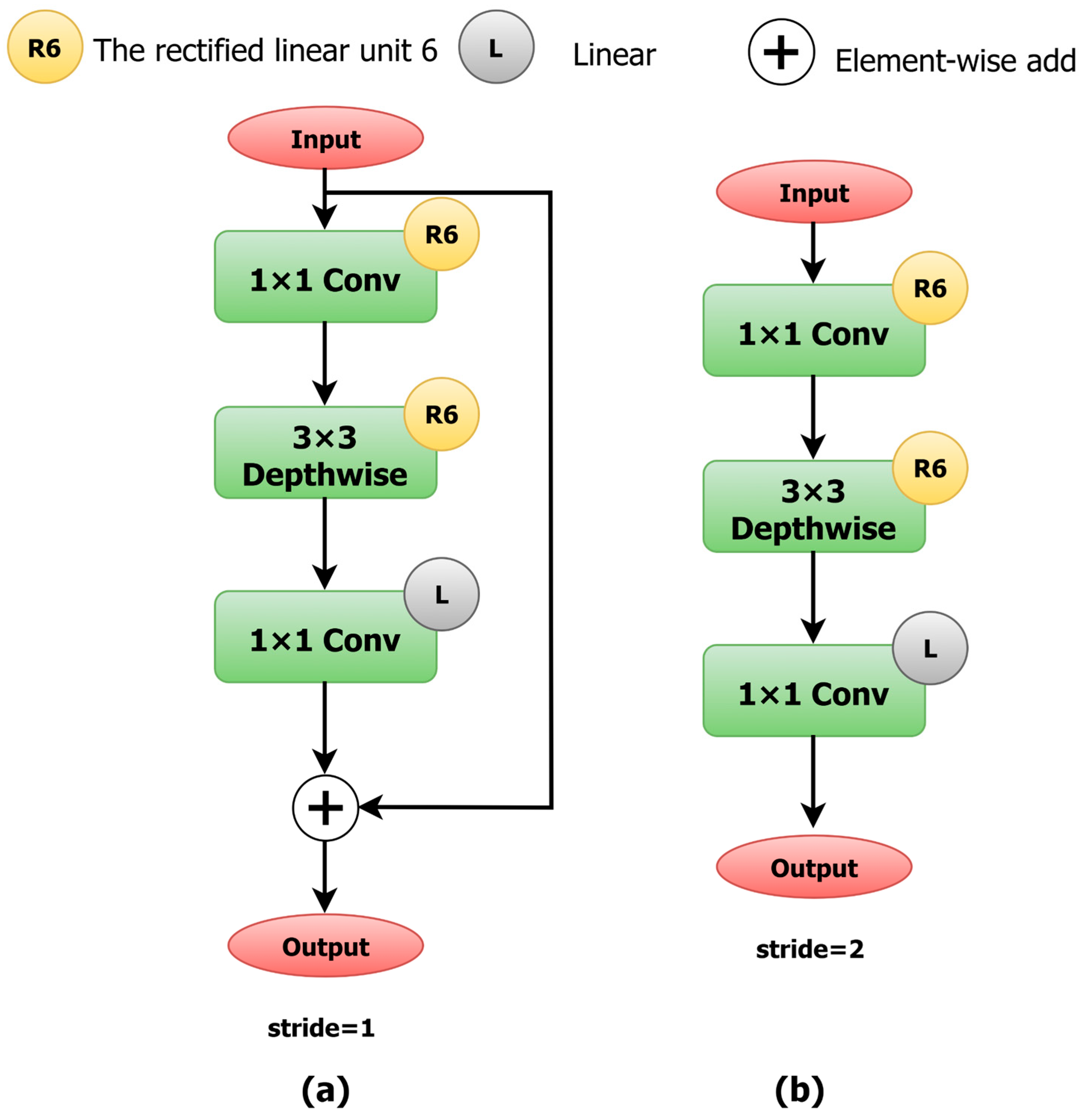 Figure 3. Structure of the Inverted Residual Block. (a) Stride-2 block without a residual connection (b) Stride-1 block with a residual connection.