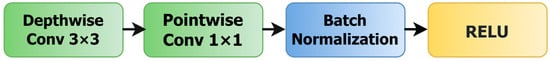 Each DSC block consists of two operations. A Depthwise Convolution (DWConv) with a 3 × 3 kernel applies independently to each input channel to extract spatial information. A Pointwise Convolution (PConv) with a 1 × 1 kernel follows this to integrate channel-wise information. Each step follows Batch Normalization (BN) and ReLU activation (see Figure 5). Each DSC block is followed by an up-sampling operation to restore spatial resolution. The Floating-Point Operations (FLOPs) required for DSC versus standard convolution are given by: