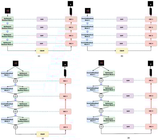 The encoder consists of four hierarchical levels. At each level, feature extraction is performed using two parallel blocks: a Bottleneck Residual Block and an Inverted Residual Block [33,34]. This dual-block structure enriches the representation while keeping the computational cost low. The Inverted Residual Block focuses on global context by expanding channels and applying depthwise convolution, whereas the Bottleneck Residual Block emphasizes local details by temporarily reducing the number of channels. The outputs of both blocks are concatenated and passed through a 2 × 2 max-pooling operation, reducing the spatial resolution by a factor of 2 at each layer. This design ensures efficient and progressive extraction of multi-scale features.