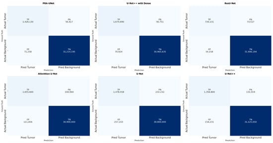 U-Net and U-Net++ both show higher error rates, especially in false negatives. U-Net, in particular, reaches 232,232 FN, the highest among all models. These results confirm that PRA-UNet achieves fewer errors in both directions—missing fewer tumors and producing fewer false detections—while remaining efficient. This supports its use in clinical settings where both precision and speed are essential.
